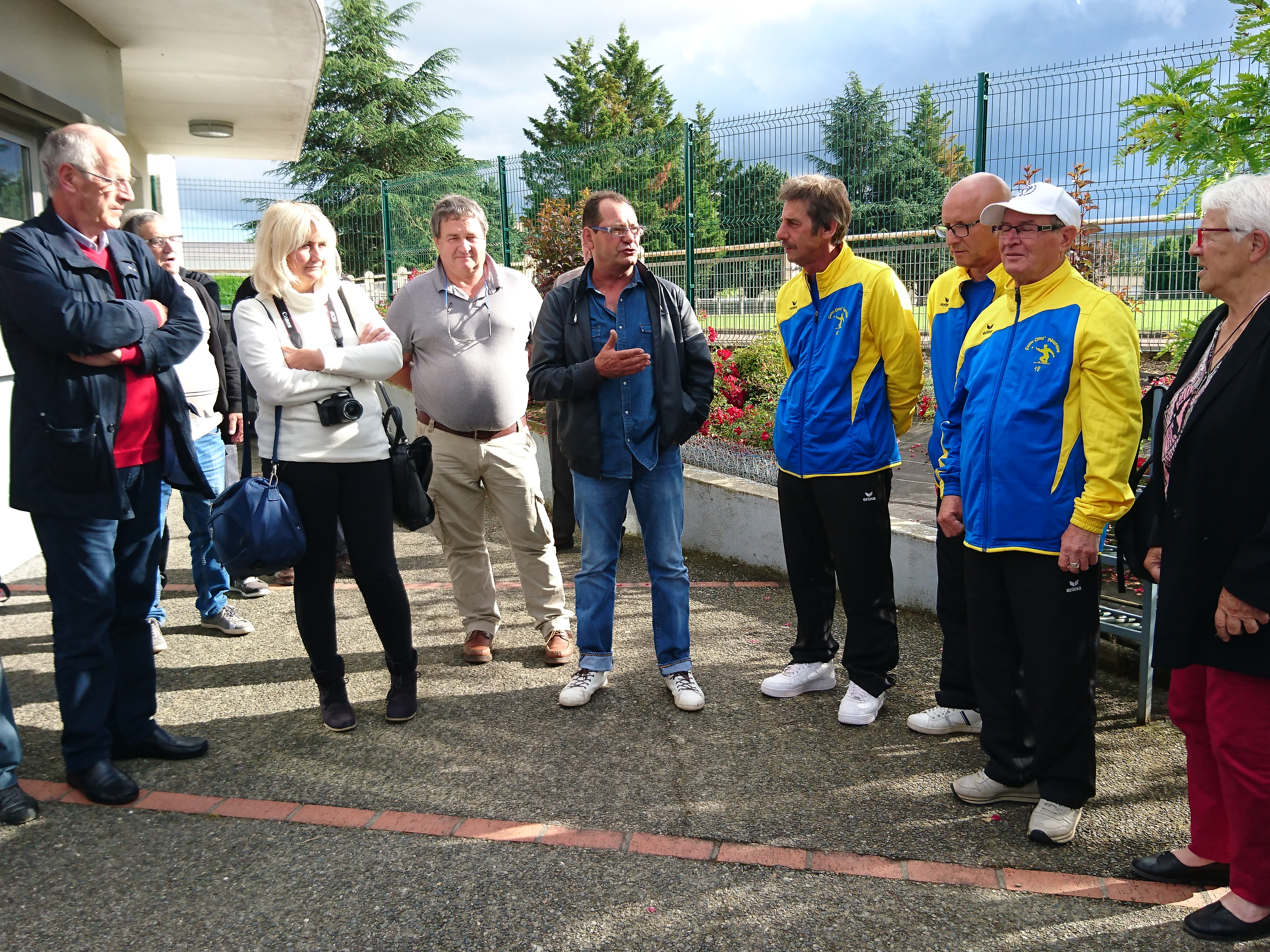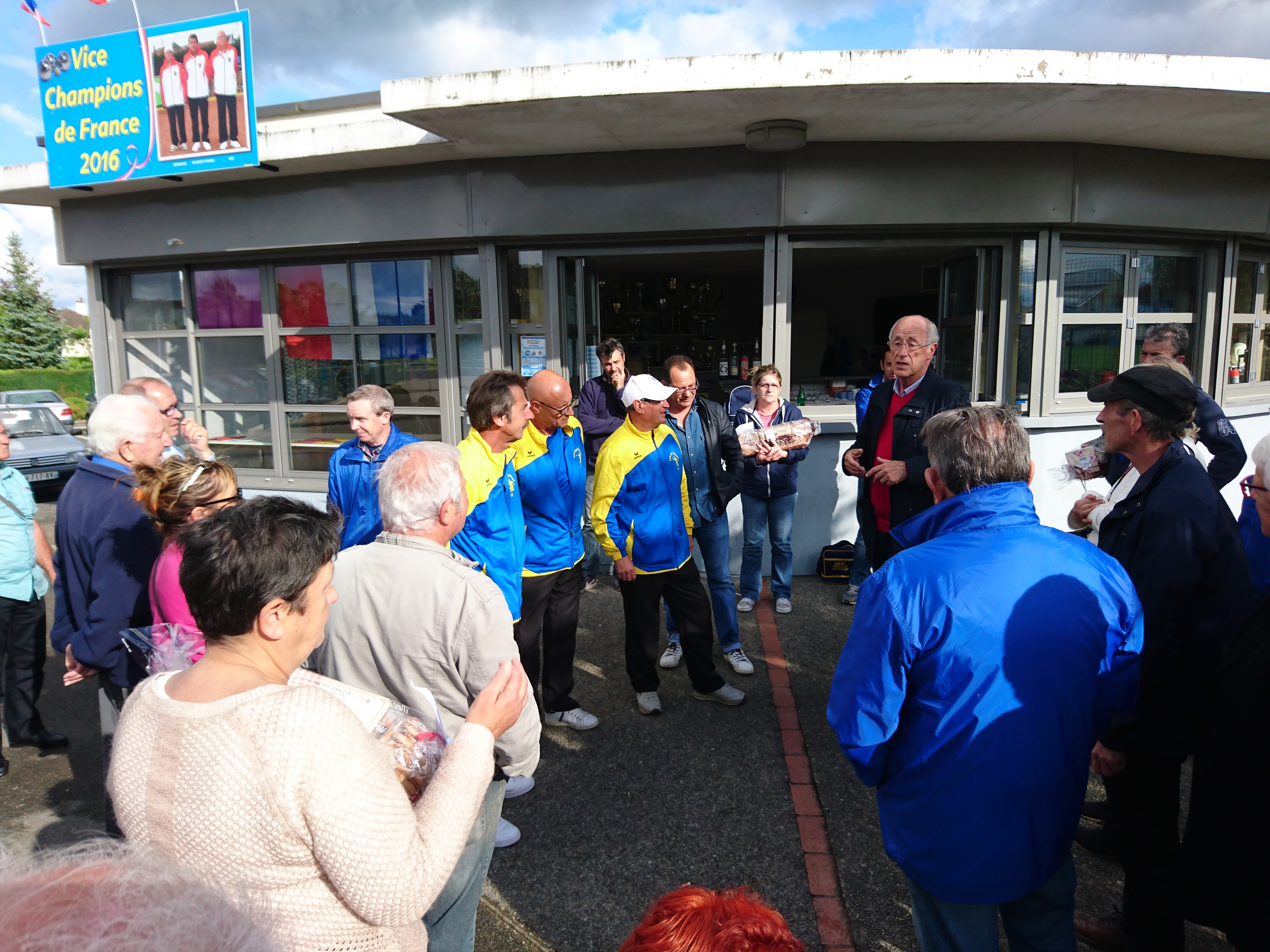 Vendredi 17 juin 2016 à 18h30 au siège du club, une petite fête était organisée pour fêter le parcours des Dolchardiens Bernard FOURNET-FAYARD, Fernando GERMANO et Dominique BIZI lors des championnats de FRANCE triplettes « vétérans » qui se sont déroulés à GUINES dans le Pas de Calais le week-end des 11 et 12 juin derniers. Et ceci en présence de M. BEZARD Maire de Saint-Doulchard, de M. Robert GUERIN Président du Comité du CHER accompagné de Mme Eliane TAIANA déléguée du Comité avec l’équipe à GUINES, de M. Gilles VERHAUVEN responsable des arbitres ainsi que de M. Patrick PETIT membre du Comité. Était également présent, accompagné de son épouse, notre ami Roland KEUTEL sans qui je me répète il n’y aurait pas eu de photo ! Merci également de la présence de Mme Nadine MARECHAL, correspondante du Berry républicain.
