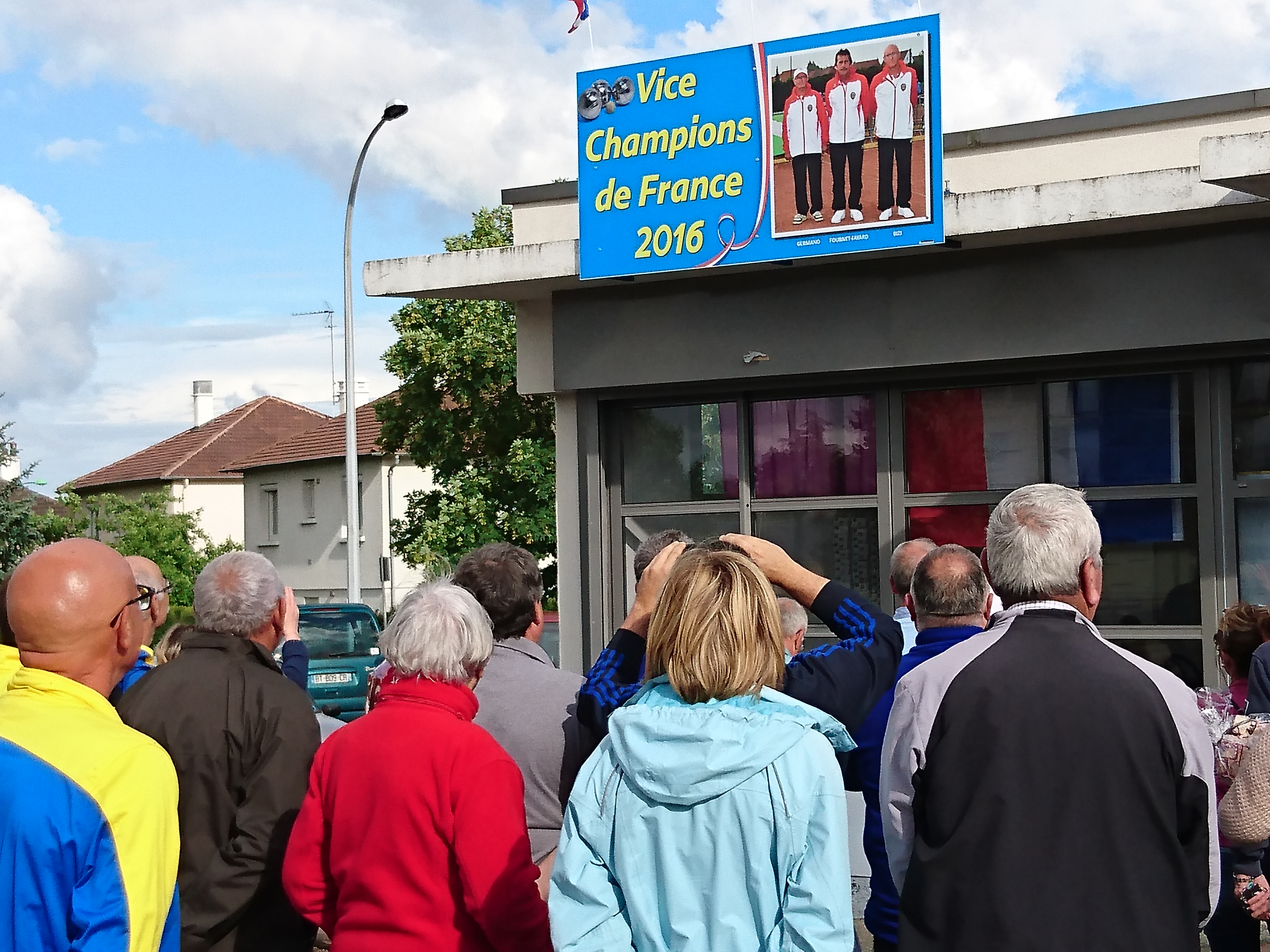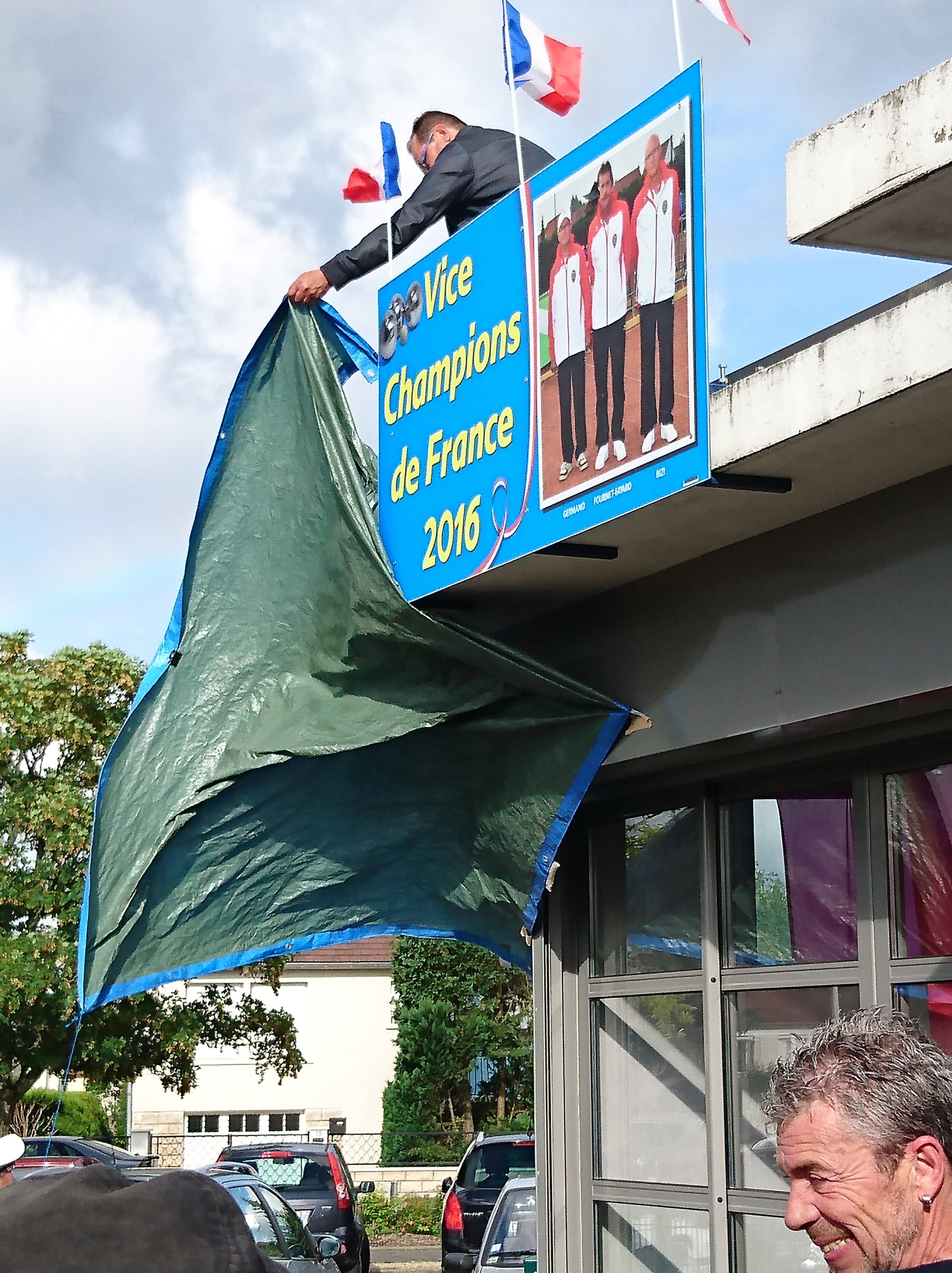 Après le discours du Président de Saint-Doul’Pétanque18 Philippe PICHONNAT et celui de M. le Maire, les joueurs et joueuses ont remis un cadeau aux 3 joueurs puis une ENORME surprise allait faire chavirer les 3 vice-champions ! ! Notre Président montait sur le toit du club house et dévoilait une immense photo des 3 Dolchardiens (2m sur 1 m ! !) sertie sur la devanture du local ! Un truc de « ouf » ! Alors PICH., Alain et le BIKER ainsi que tous les membres du club, sachez que si on vous a fait vibrer lors de ces championnats de FRANCE hé bien vous, vous nous avez touché en plein cœur ! Vous auriez voulu nous faire pleurer que vous ne vous y seriez pas pris autrement ! Vous avez tapé dans le mille ! Ce que vous avez fait restera gravé à jamais dans nos têtes, on ne trouvera pas de mots assez forts pour vous faire part du plaisir que vous nous avez donné ce soir ! Un seul regret, ne pas avoir rapporté le maillot tricolore, il aurait eu sa place dans notre local, et il y en aurait eu un pour Eliane que l’on a fait souffrir durant 2 jours pour sa dernière délégation. Mais on lui aura donné beaucoup de bonheur jusqu’à la voir verser sa petite larme elle aussi !