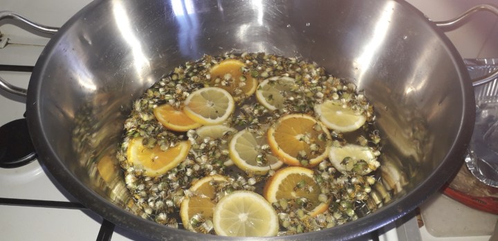 Pendant que certains font du pain (Kévin et votre serviteur), ou des tomates et aubergines farcies (Georges), d’autres font dans la confiture, ou plutôt dans la gelée… La gelée de fleurs de pissenlits ! C’est Danielle, la compagne de « Rouletabille » qui est à l’œuvre. Ça fait envie de tartiner sur le pain doré de Kévin ! Danielle tu me mets un petit pot de côté… merci !