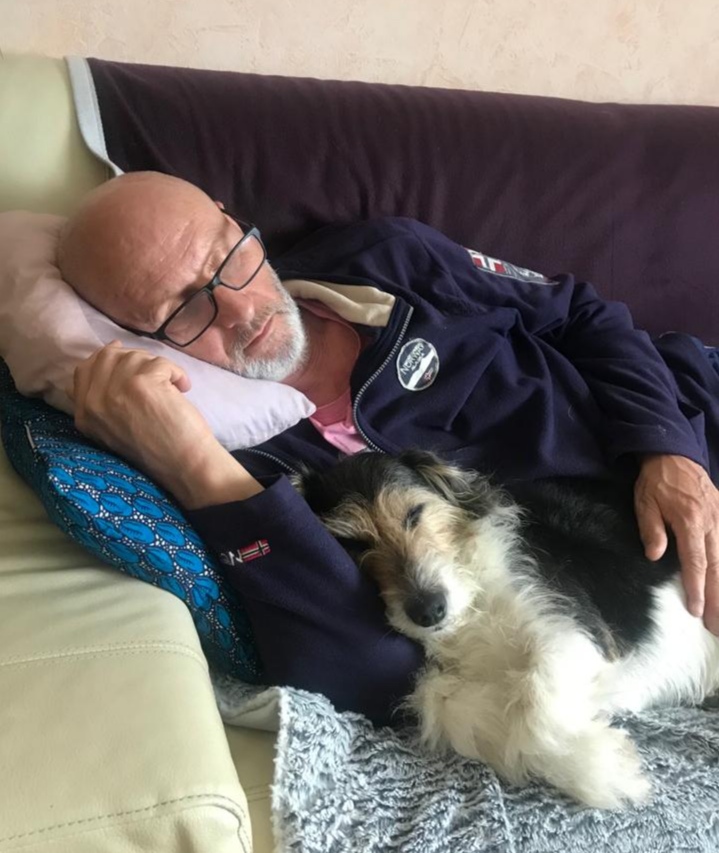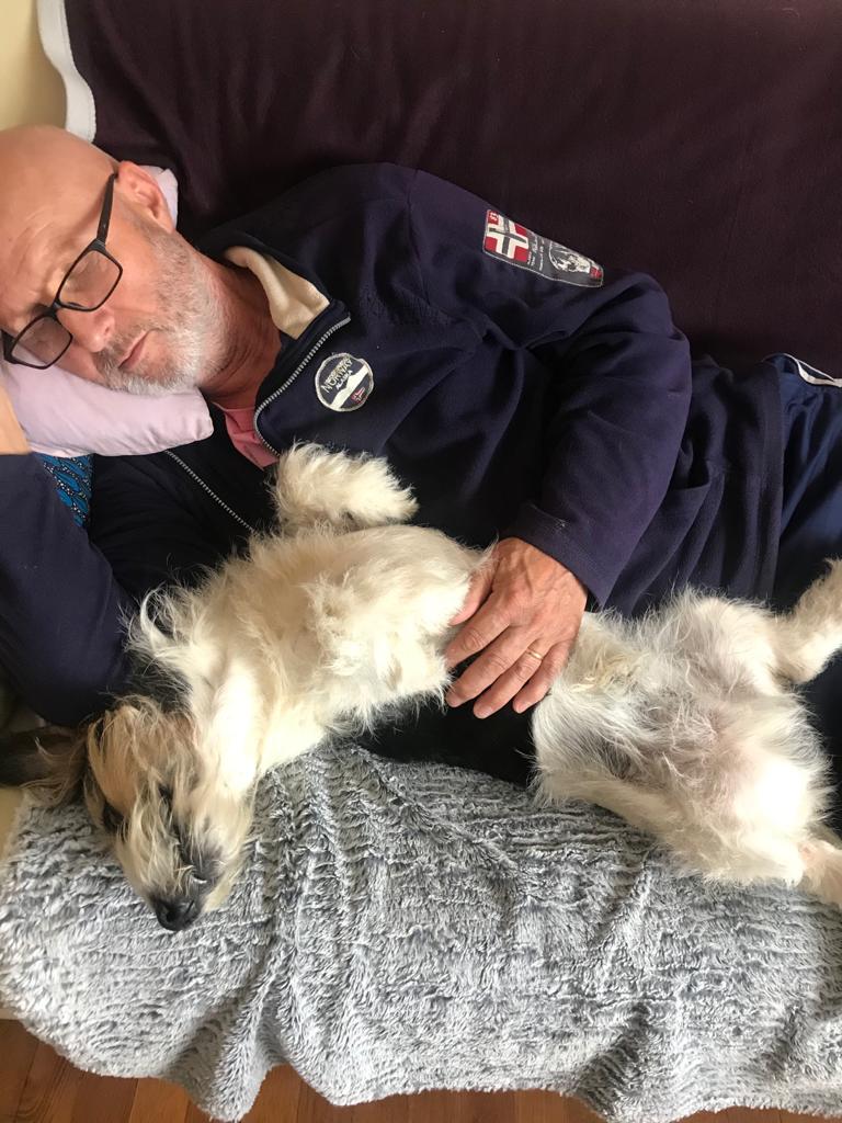 … Yoko au plus près de son maître. Journée peu ensoleillée, alors sieste de rigueur…