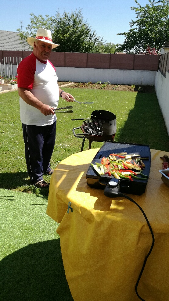 BBQ chez les « MACIA« … Le Percheron aux manettes, chapeau aux couleurs du maillot, quelle classe !