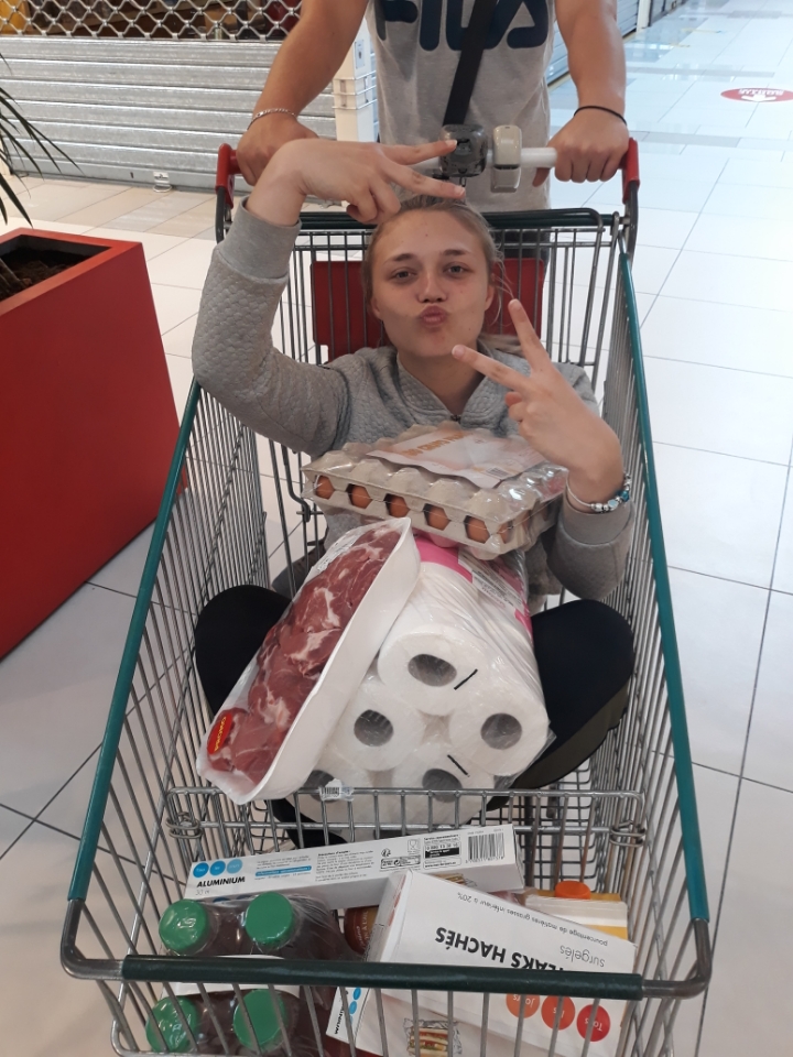 Mais avant AUDRY (qu’on ne voit pas parce qu’il pousse le caddy) fait les courses avec Sephora… On constate que ce n’est pas destiné à Waouff dit FEG, il n’y a pas de bouillon !