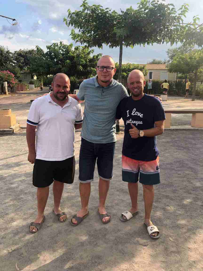 …pour notre jeune licencié Kévin LAMAMY. Et Kevin est très bien entouré puisque à sa droite il y a Stéphane ROBINEAU et à sa gauche Ludovic MONTORO ! Deux joueurs qu’on voit souvent à la télévision surtout au cours des « Masters » de Pétanque. Bravo Kévin, belle photo collector, et bonnes vacances !