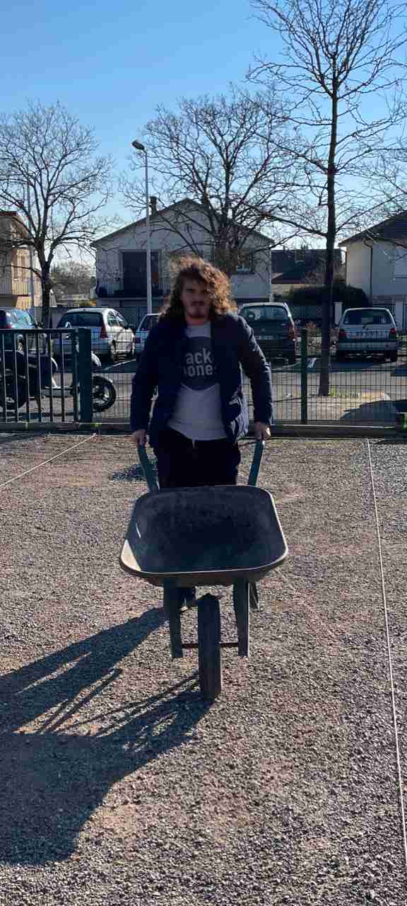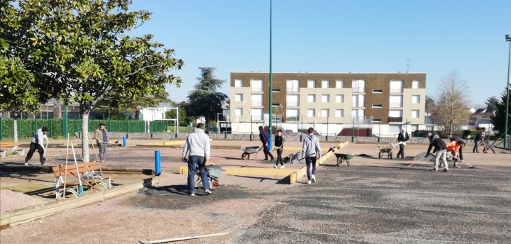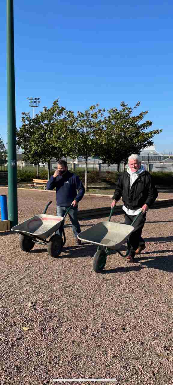 …Et ce grâce à l’aide d’un grand nombre d’adhérents, licenciés ou membres honoraires ! Du jamais vu à St Doul pétanque depuis que je fréquente le club (2007) ! ! 18 personnes ont pris brouettes, pelles et râteaux pour enlever les excès de gros gravillons qui rendaient les terrains difficiles à pratiquer, surtout pour les pointeurs ! Il est vrai que l’appoint était devenu un peu aléatoire (alors qu’on est dans le Cher et pas dans les Deux-Sèvres ! ! Bof).