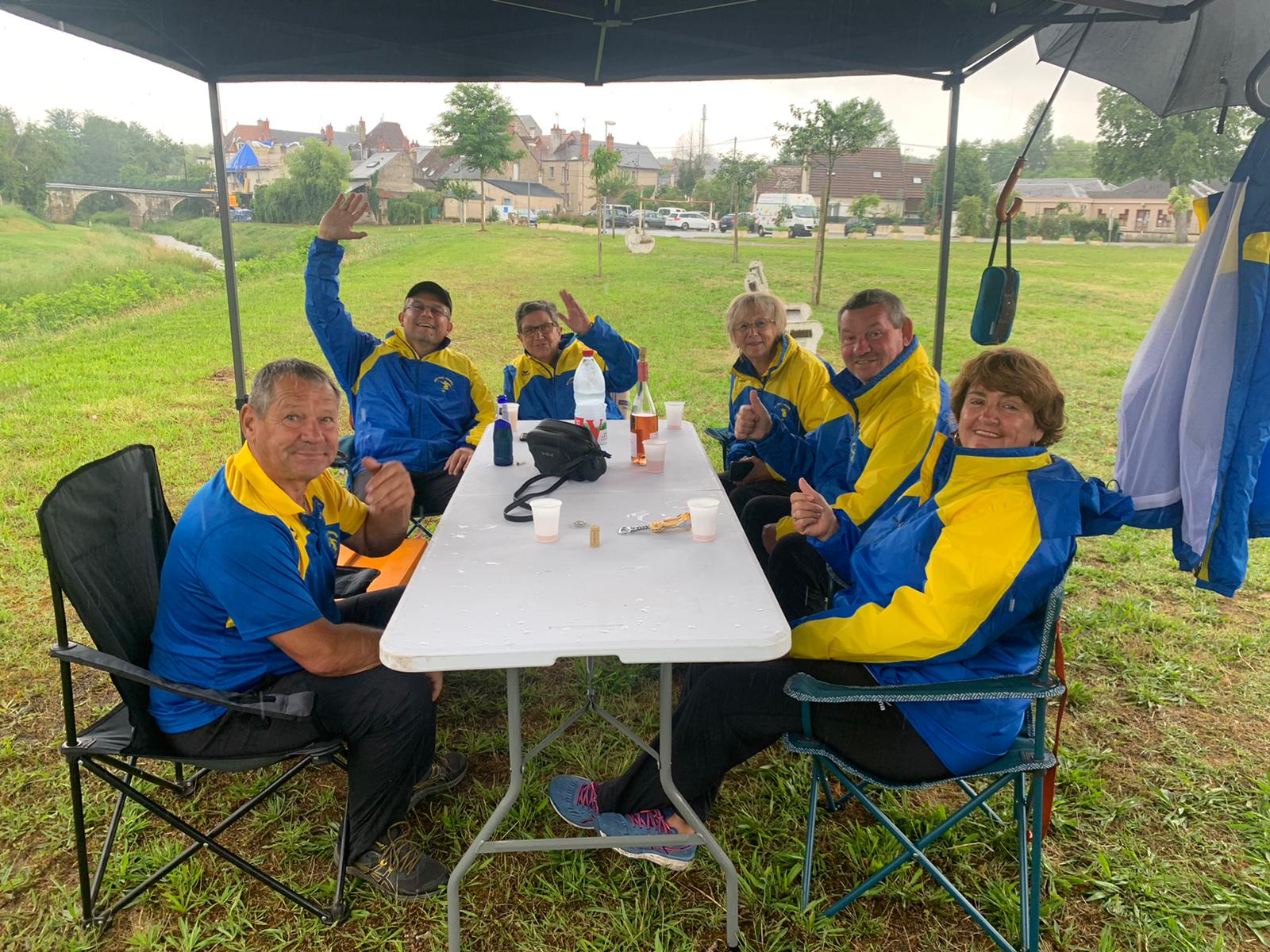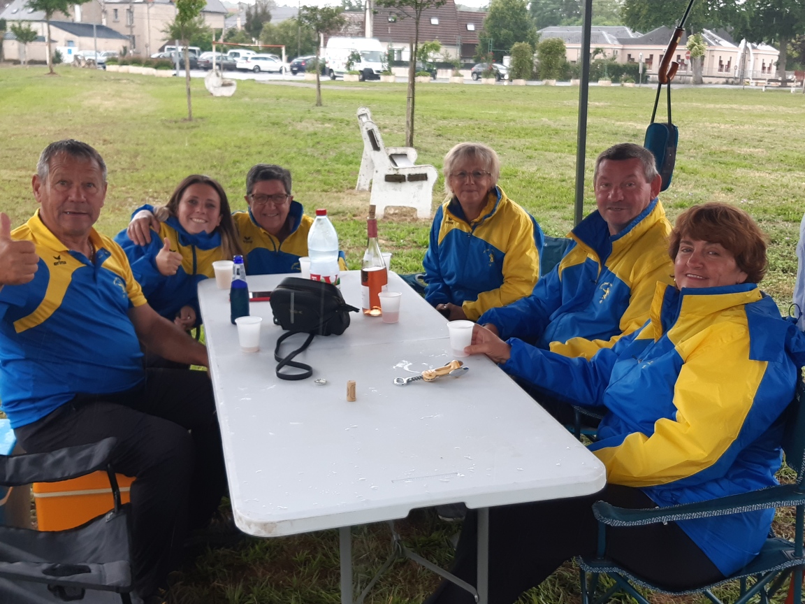 Dolchardiennes et Dolchardiens ont bravé la pluie pour casser la croûte avant le championnat doublettes mixtes qui débute à 14h00….Pas de sieste en perspective avant le début de la compétition…Quant à moi elle se fera à l’abri…des intempéries, et des regards…LOL !