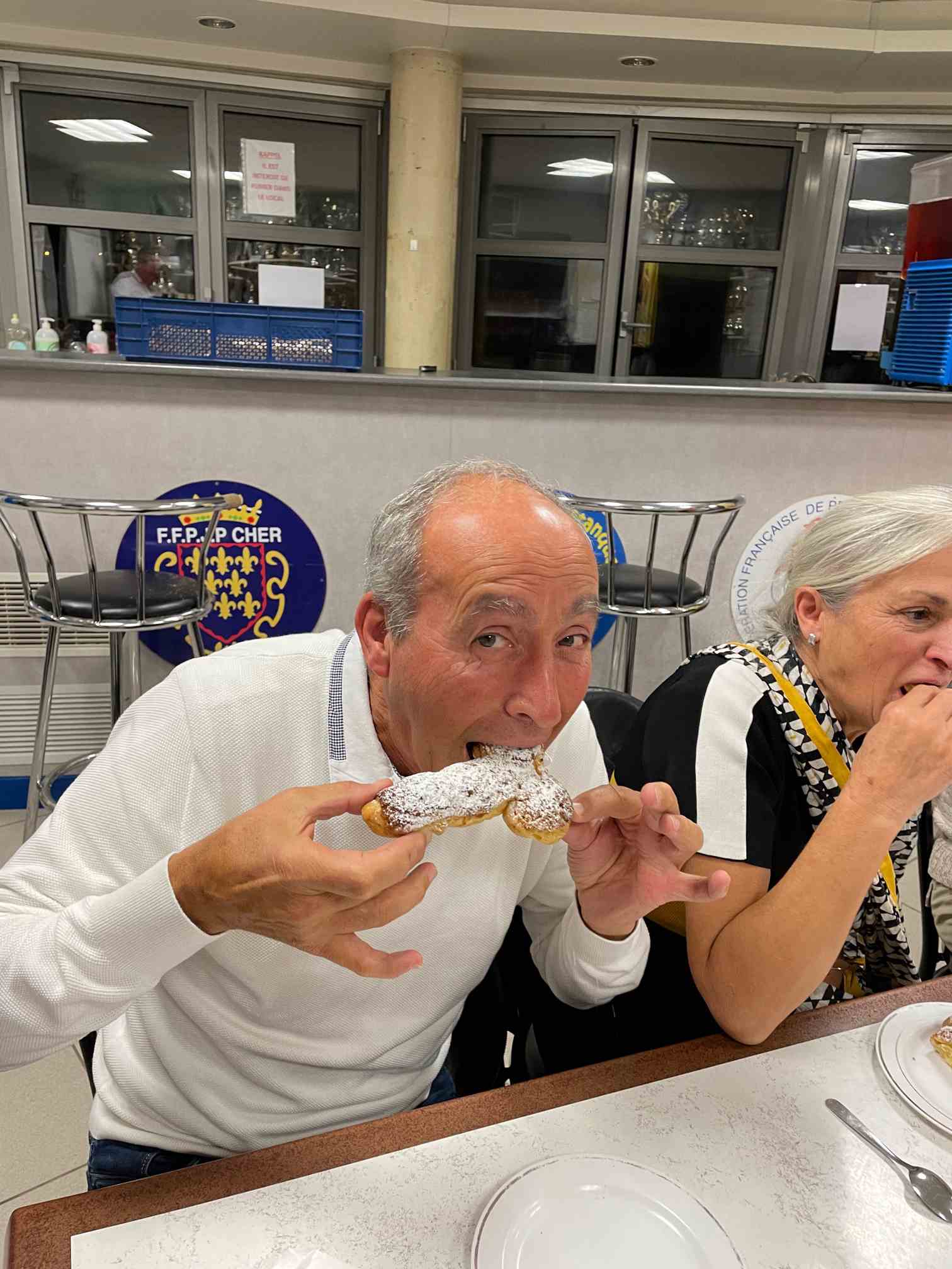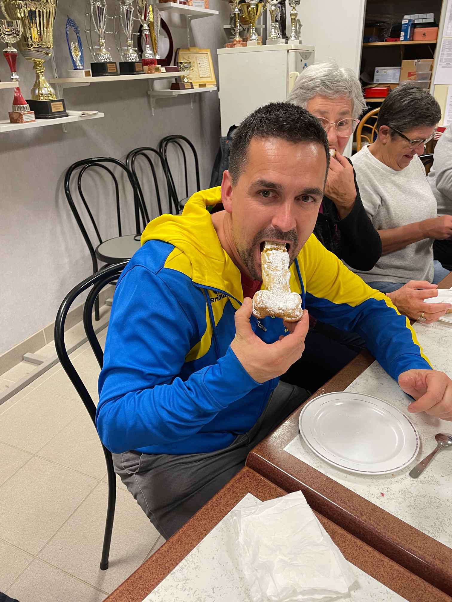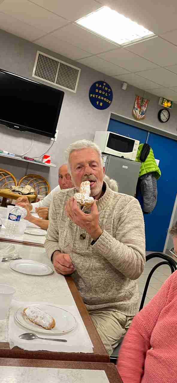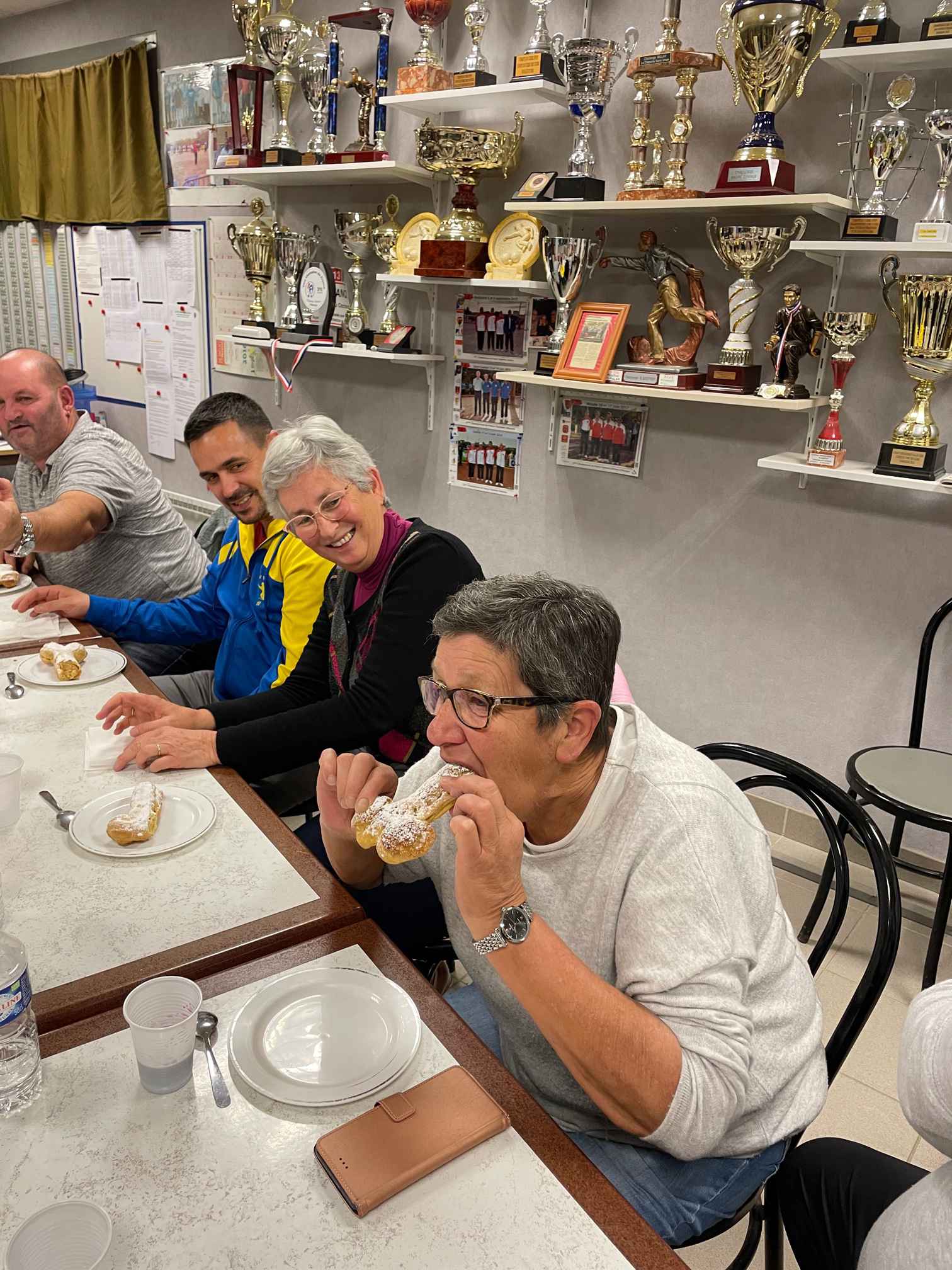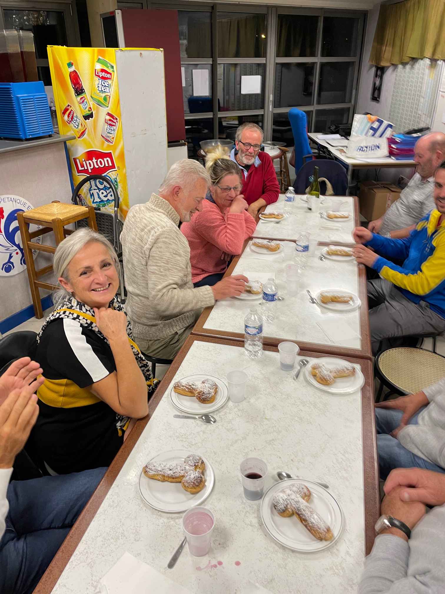 Joueurs et conjoints étaient donc conviés à festoyer, en témoigne les photos qui suivent où l’on voit Martine et Hervé, Tatave et sa compagne, Jo, Claude, Mathieu et quelques invités, Isa, Nadine et Michel pris en flagrant délit d’engloutissement d’un gâteau qui me semble « libidineux »…(je dirais plutôt une grosse quéquette !).