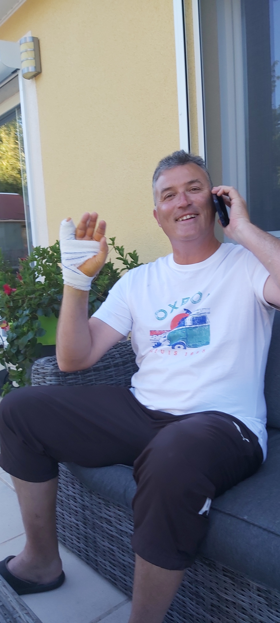 …ou alors il va devoir jouer avec la main gauche ! Notre ami Manu, dit « Glouton », a du faire un aller retour rapide à l’hôpital d’Orléans pour une petite intervention sur la main droite hélas ! Pas grave tout s’est bien passé, de plus la canicule va certainement contraindre pas mal d’entre nous à se terrer dans l’ombre, à la suite de ça tu devrais pouvoir reprendre les boules !
