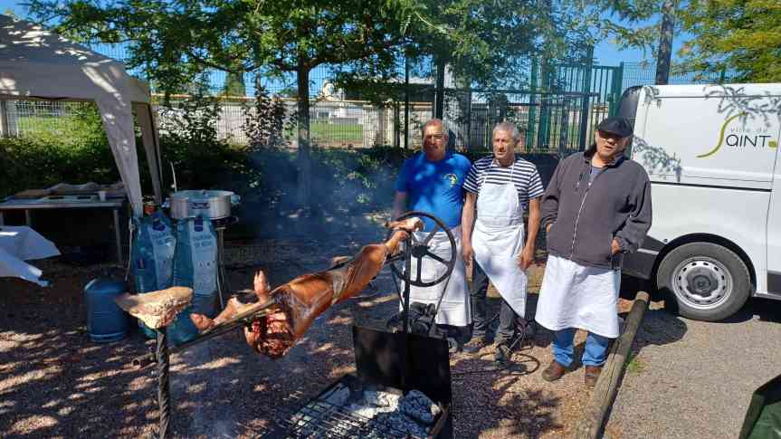 Nous sommes alors passés aux « choses sérieuses » en nous regroupant autour du vin d’honneur. Puis nous avons pris place à table où nous attendait un repas préparé par MM NEUBAUER et LAURO, ainsi que Saïd, « maître boucher », pour déguster un superbe cochon de lait préparé à la broche depuis 4h30 du matin (merci Georges).