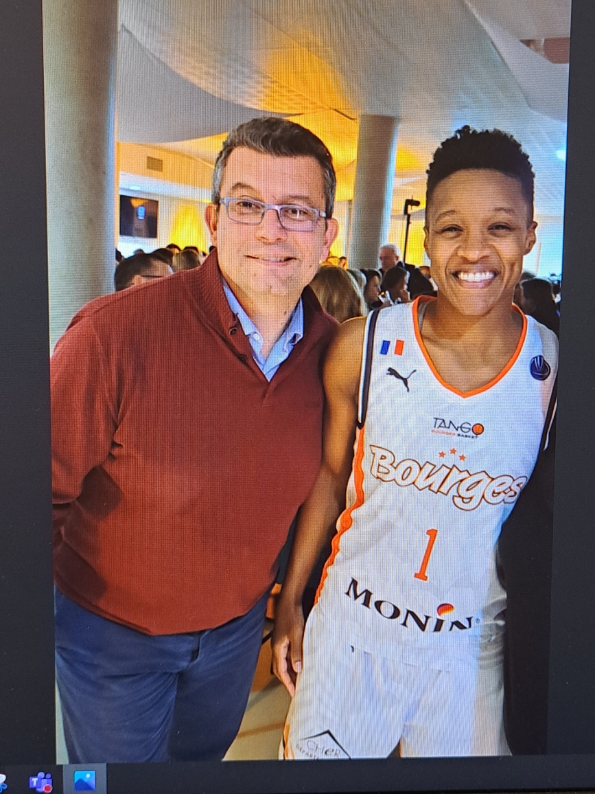 Quant à notre ami Jean-luc BEAUCHER dit « Jean2x » fervent supporter de l’équipe féminine de basket de Bourges, il a bien fait d’assister au match de coupe d’Europe hier soir. Non seulement la rencontre contre Valence (Espagne) a du être stressante puisque victoire 70 à 68, mais il a eu le bonheur de poser pour l’éternité avec la meneuse des « Tangos », l’Américano-Serbe Yvonne ANDERSON ! A l’entendre si elle est aussi douée à la pétanque qu’au basket, il lui proposerait licence gratuite pendant 10 ans ! A suivre ! LOL !