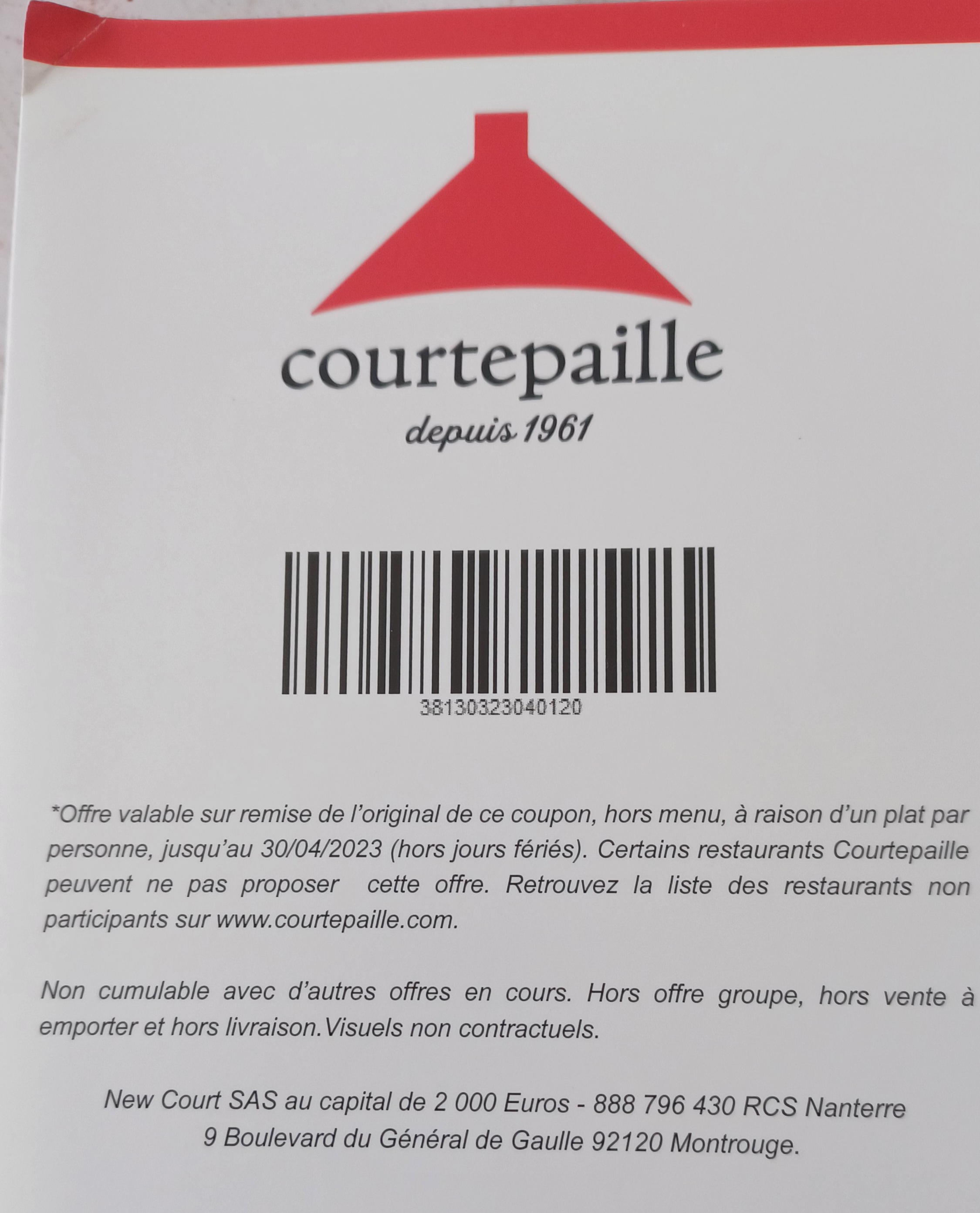 Bonjour à toutes et à tous, dans le cadre de nos opérations de sponsoring, nous avons récupéré des offres spéciales pour le grill restaurant « Courtepaille » de St Doulchard ou de la ZAC de l’autoroute. Les coupons, valables jusqu’au 30 avril, sont disponibles au club.
