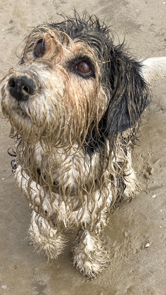 Petit retour sur notre villégiature en Vendée avec une photo de Yoko après bain de mer et bain de boue…Pas glop !