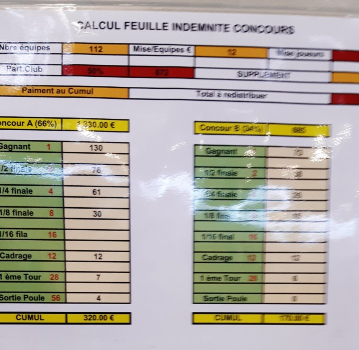 Et le pompon pour la fin, les indemnités ! Les mises + 50 %, seulement pour ceux qui sont sortis de poule c’était 4,00 euros ! ! Et puis s’ils gagnaient la 1ère après poules c’était 7 euros ! ! Donc même pas remboursés après avoir gagné 3 parties ! J’ai 45 ans de pétanque derrière moi, je n’ai jamais vu ça ! Pourtant les règlements prévoient que les équipes doivent être remboursées après 2 parties gagnées ! Il arrive souvent qu’il nous manque un euro, mais apparemment ce serait la faute du logiciel !