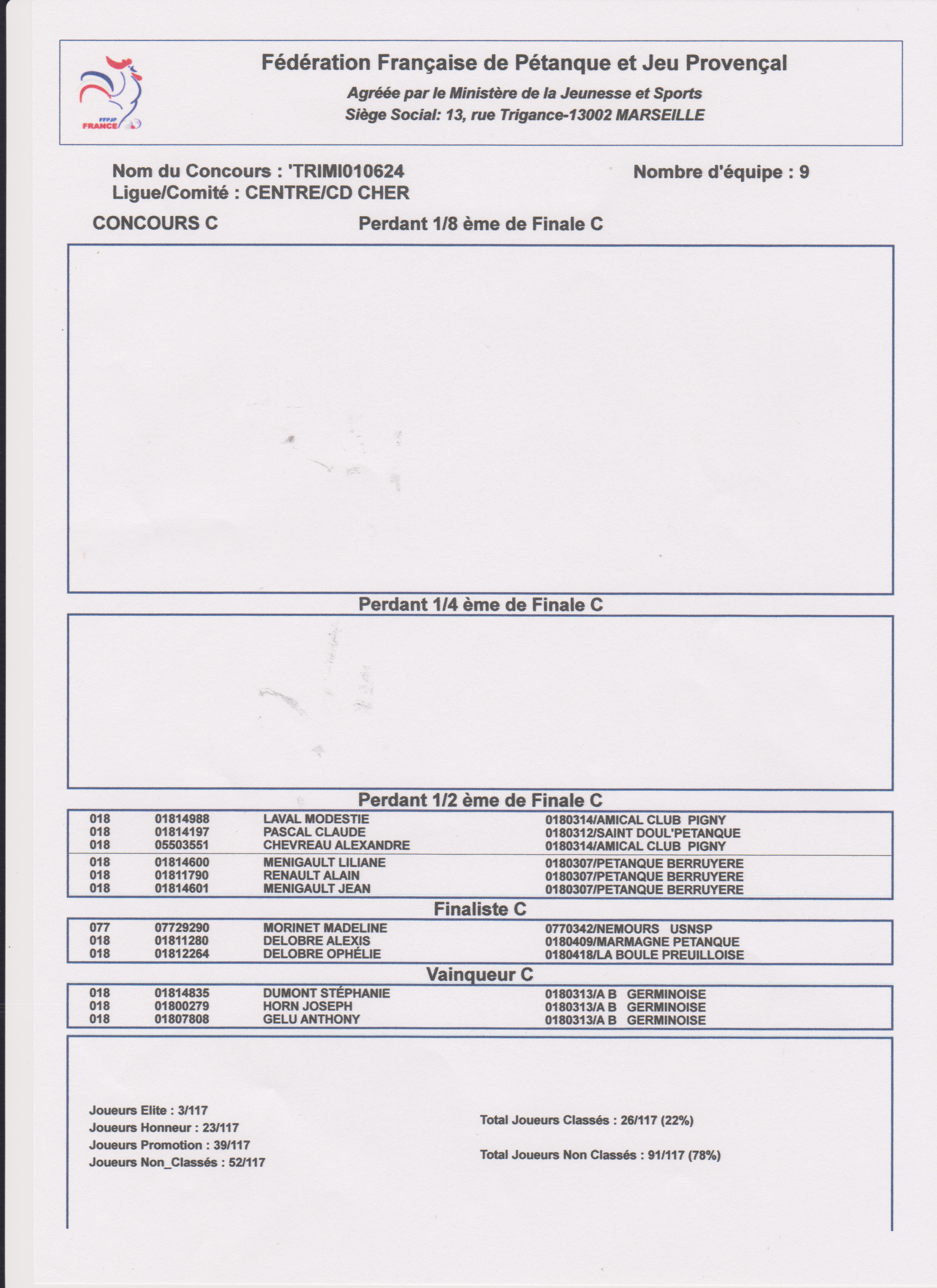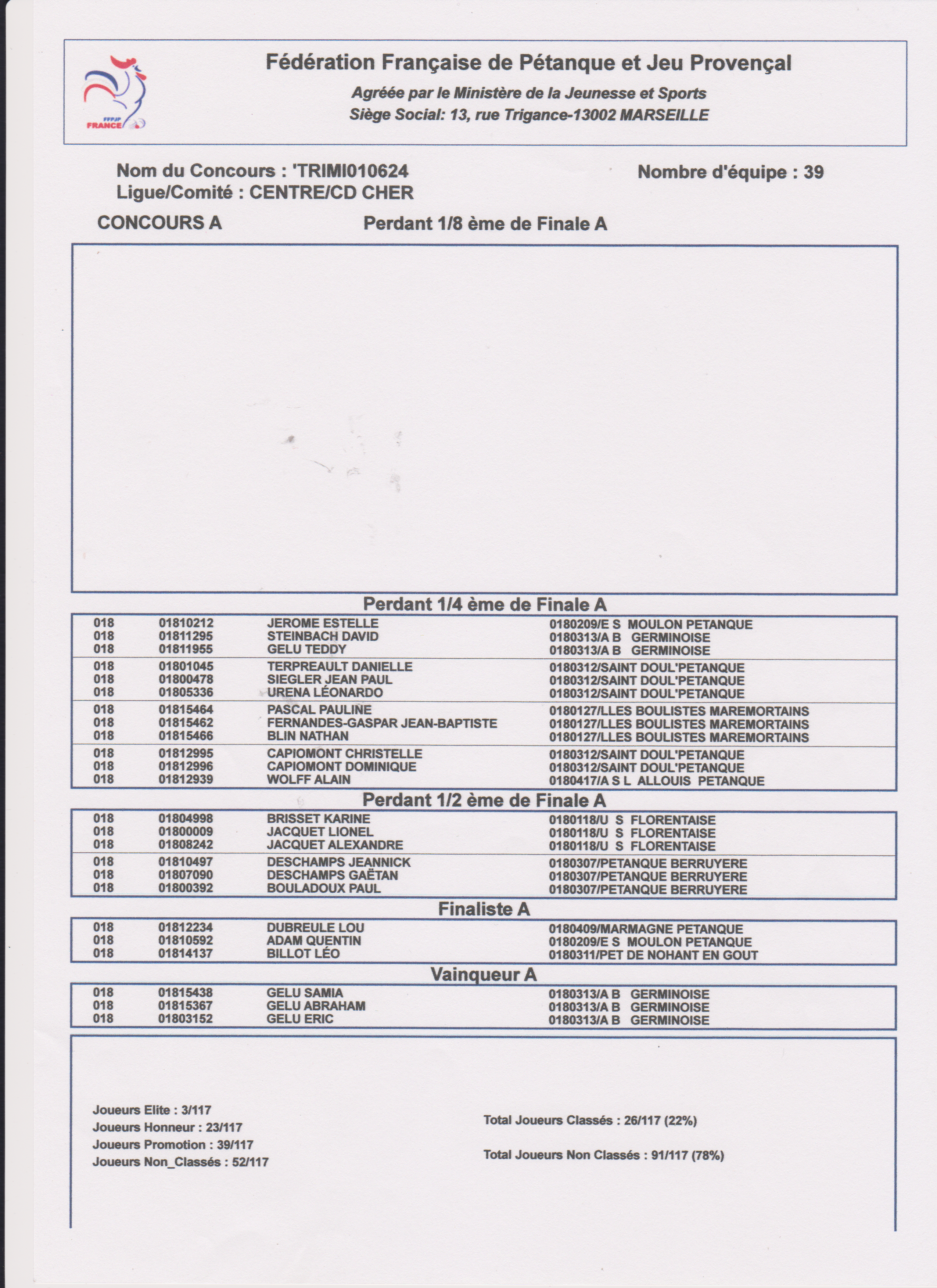 Côté Dolchardien, 3 équipes homogènes et 5 équipes NH avec 1 défaite en 1/4 de finale du Général pour TERPREAULT-URENA-JPS, et pour Christelle et Dominique CAPIOMONT associés à « Waouff dit FEG » d’Allouis.