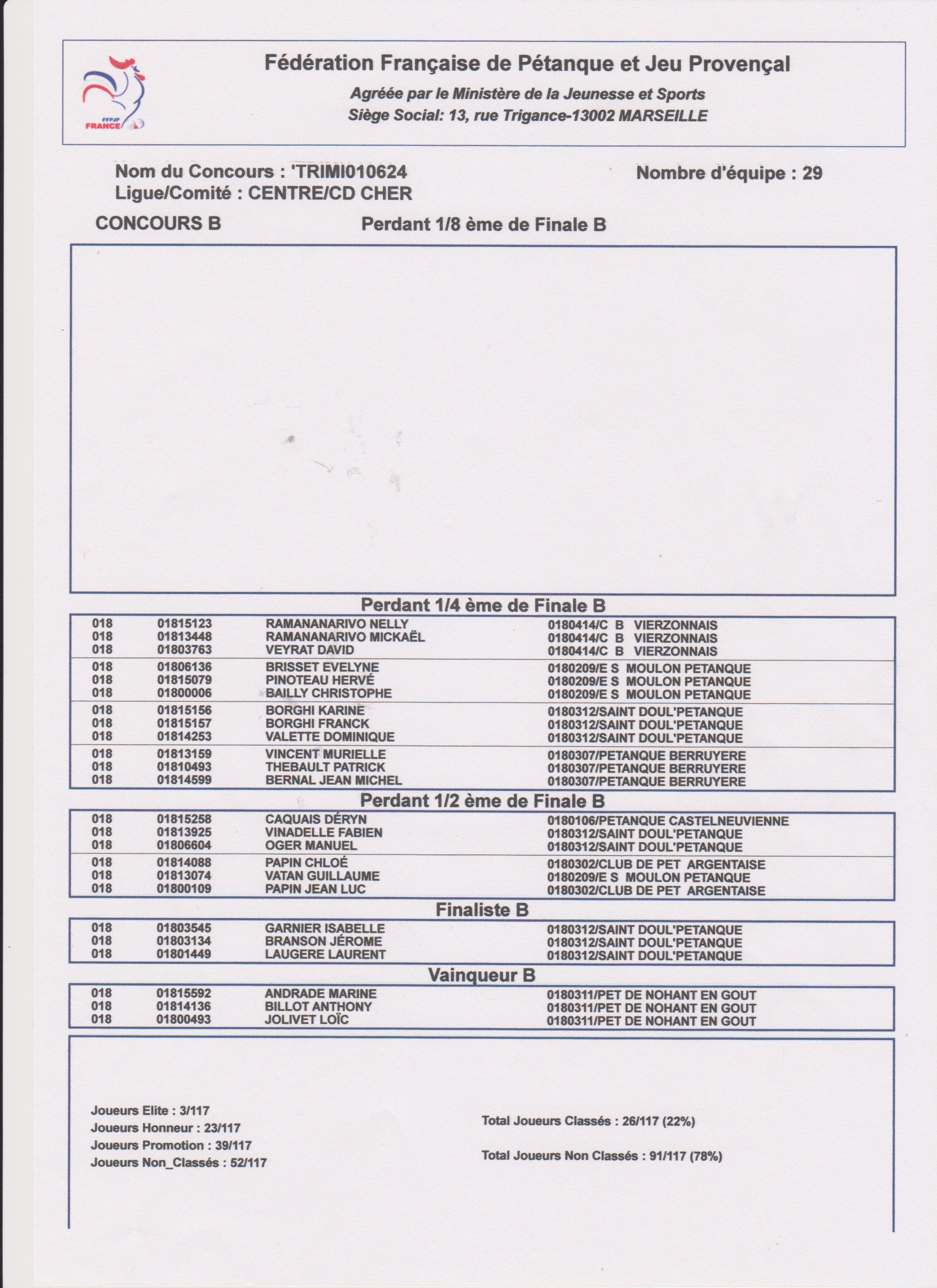 En complémentaire défaite en 1/4 de finale pour BORGHI Karine et Franck-Coco, mais 1/2 finale pour CAQUAIS Déryn(Châteauneuf) associée à Manu et « Ptitbouc », et finaliste pour Isa-Jérôme-Lolo.