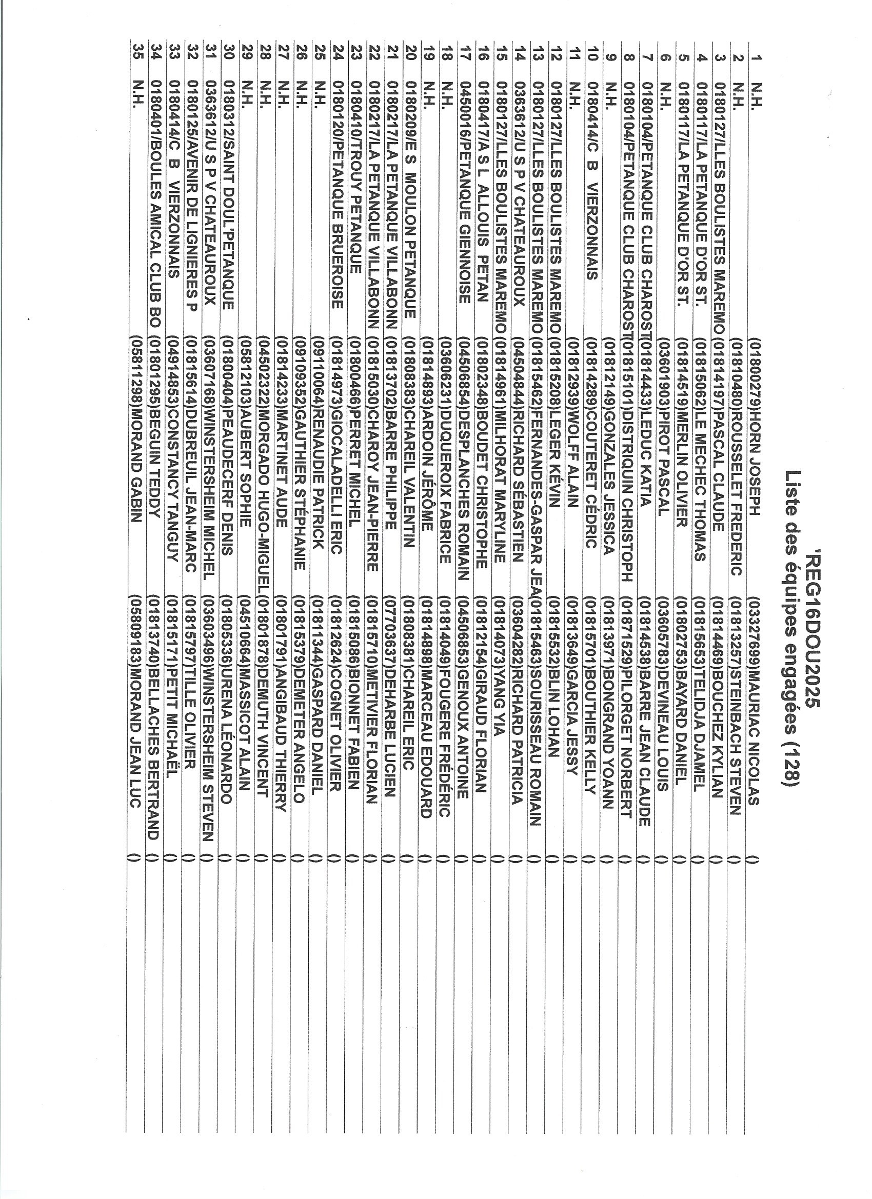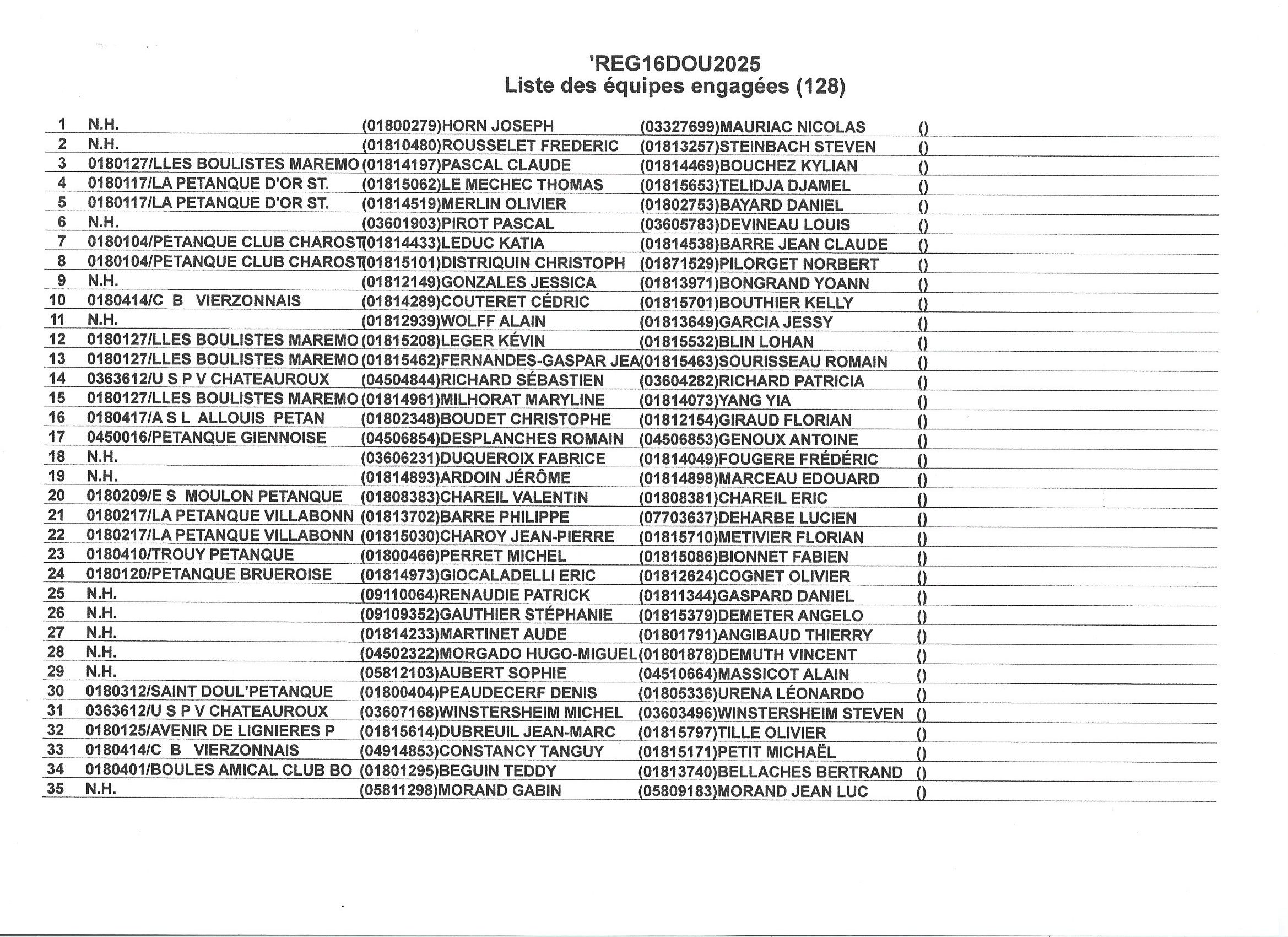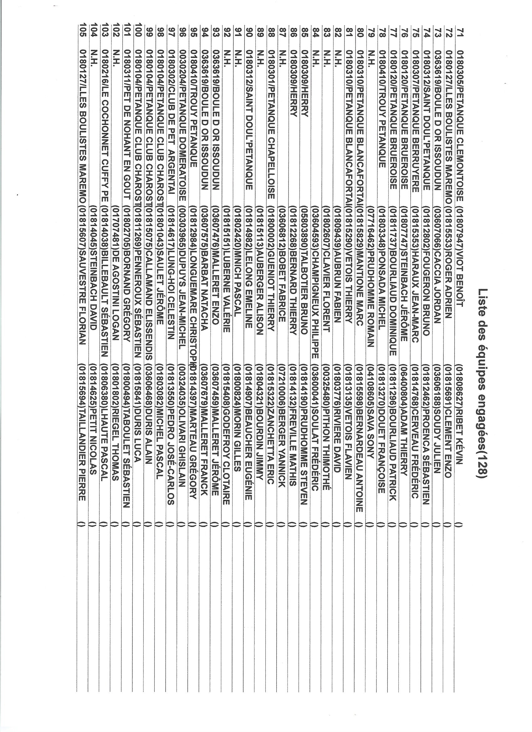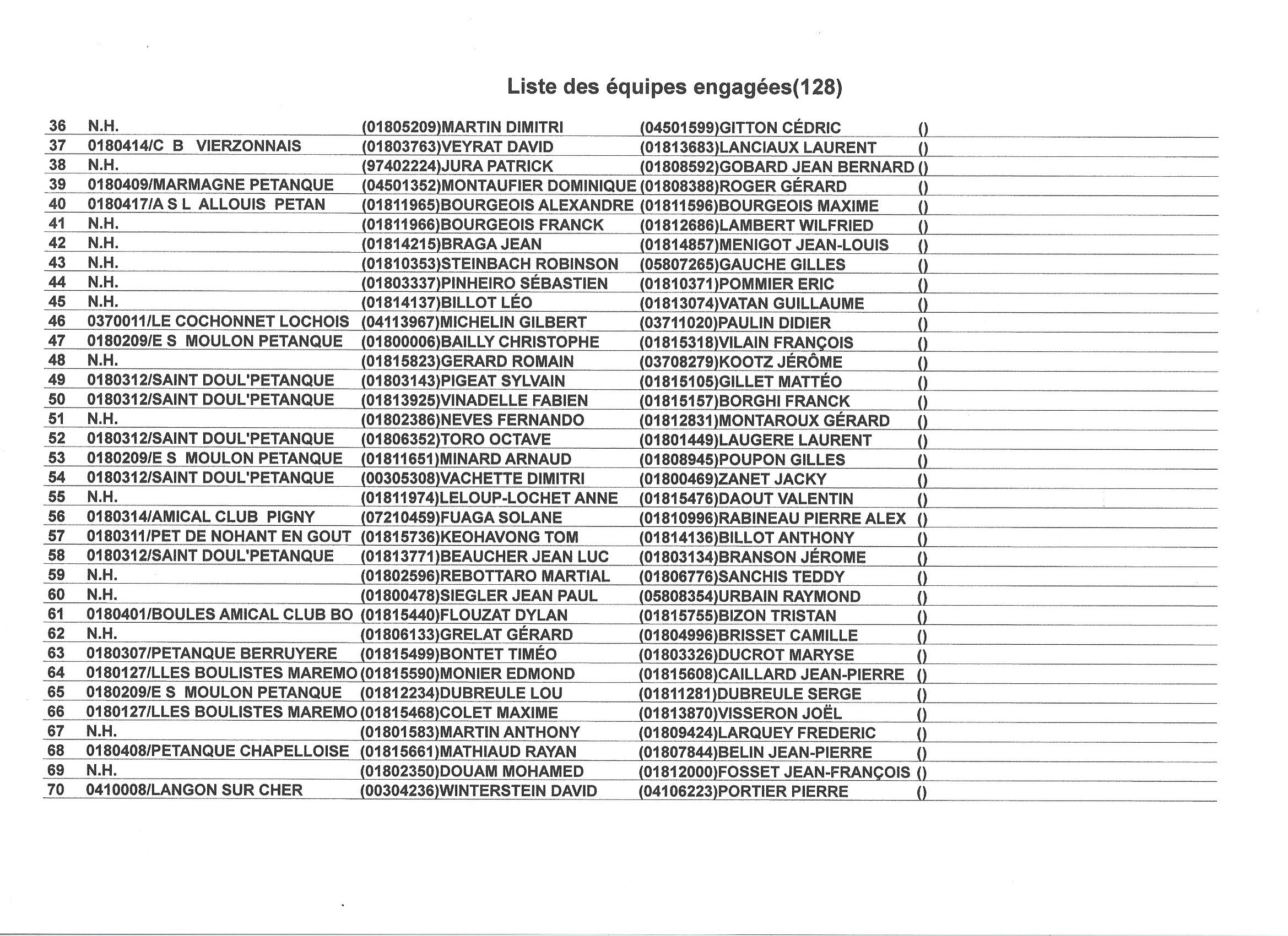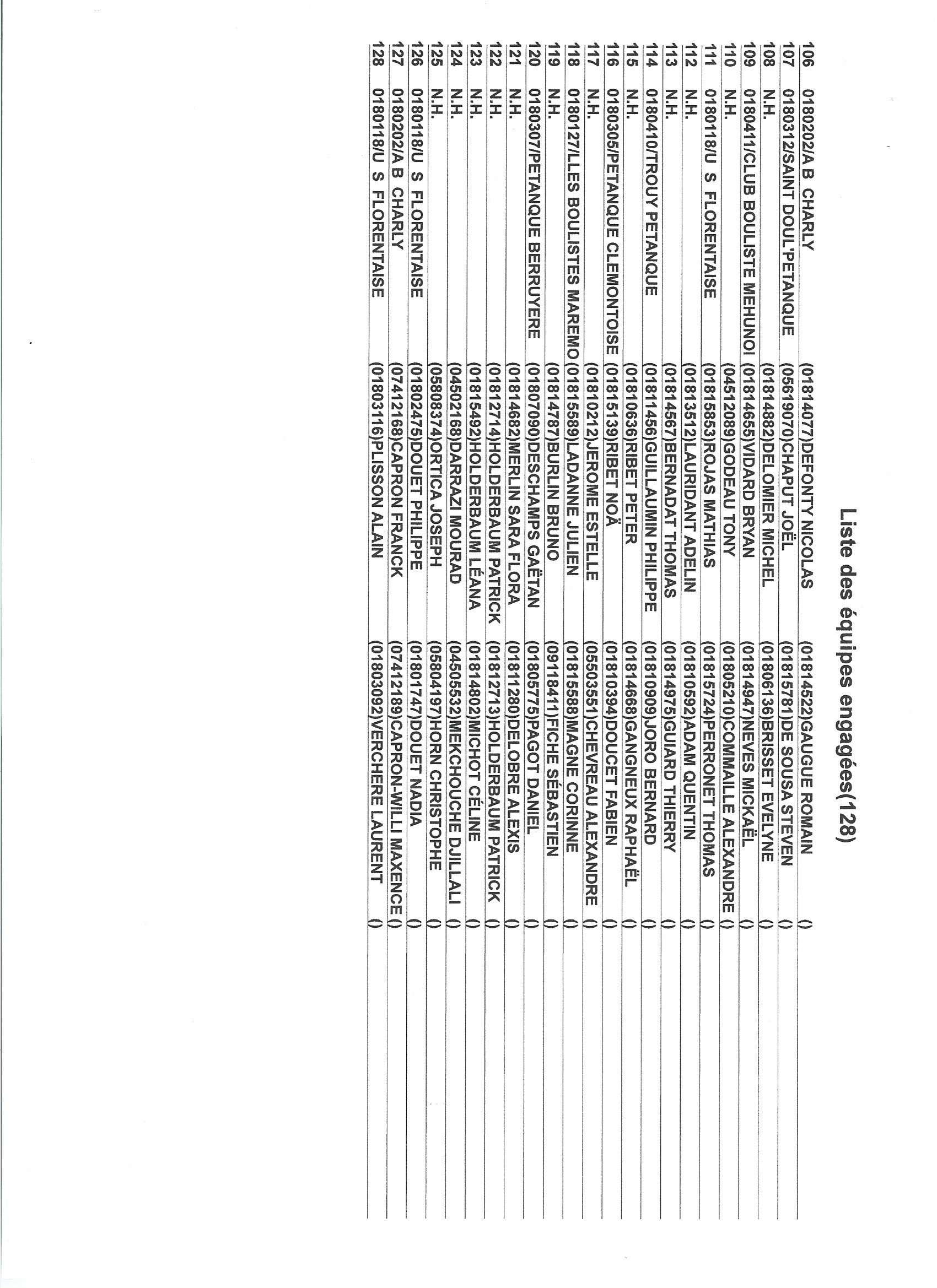…comme promis vous trouverez ci-dessous les 128 engagés. N’oubliez pas que le jet de but est fixé à 8h30, que seules les équipes sortant de poules sont qualifiées pour le Régional avec remise des engagements + 1 500.00 €. Les équipes ne sortant pas de poules pourront s’inscrire dans le concours annexe (A et B, pas de consolante) en doublette moyennant une mise de 8.00 €, le jet de but se fera à 14h30 précises !