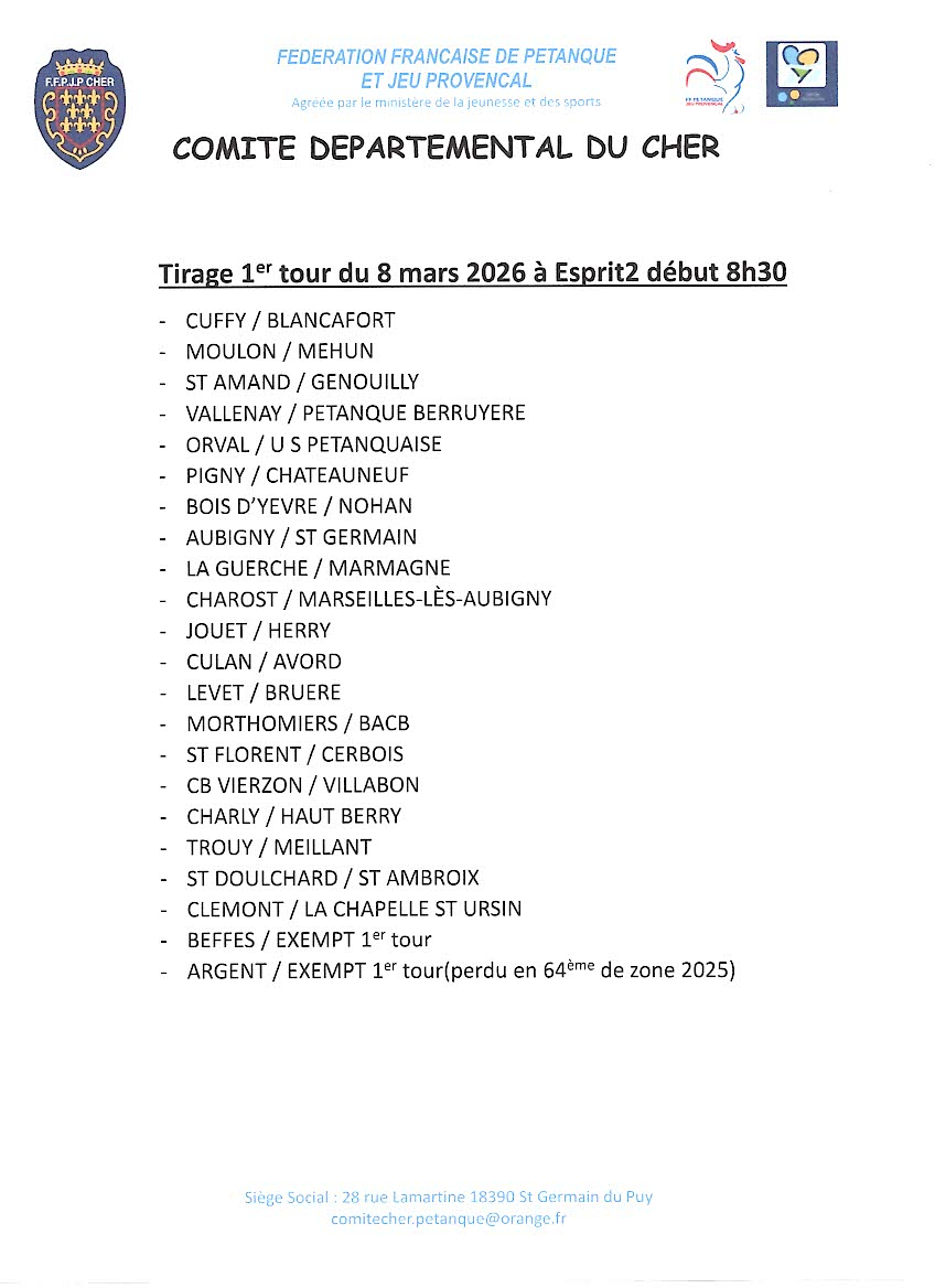 …le 1er tour de la compétition est prévu dimanche 8 mars matin avec un 2ème tour l’après-midi ainsi que le 1er tour de la coupe du Cher. Pour Saint-Doul’Pétanque 18 ça sera contre un nouveau club créé en 2026, Saint-Ambroix. Deux exempts, Beffes (exempt de T1) et Argent (perdant des 1/64èmes)