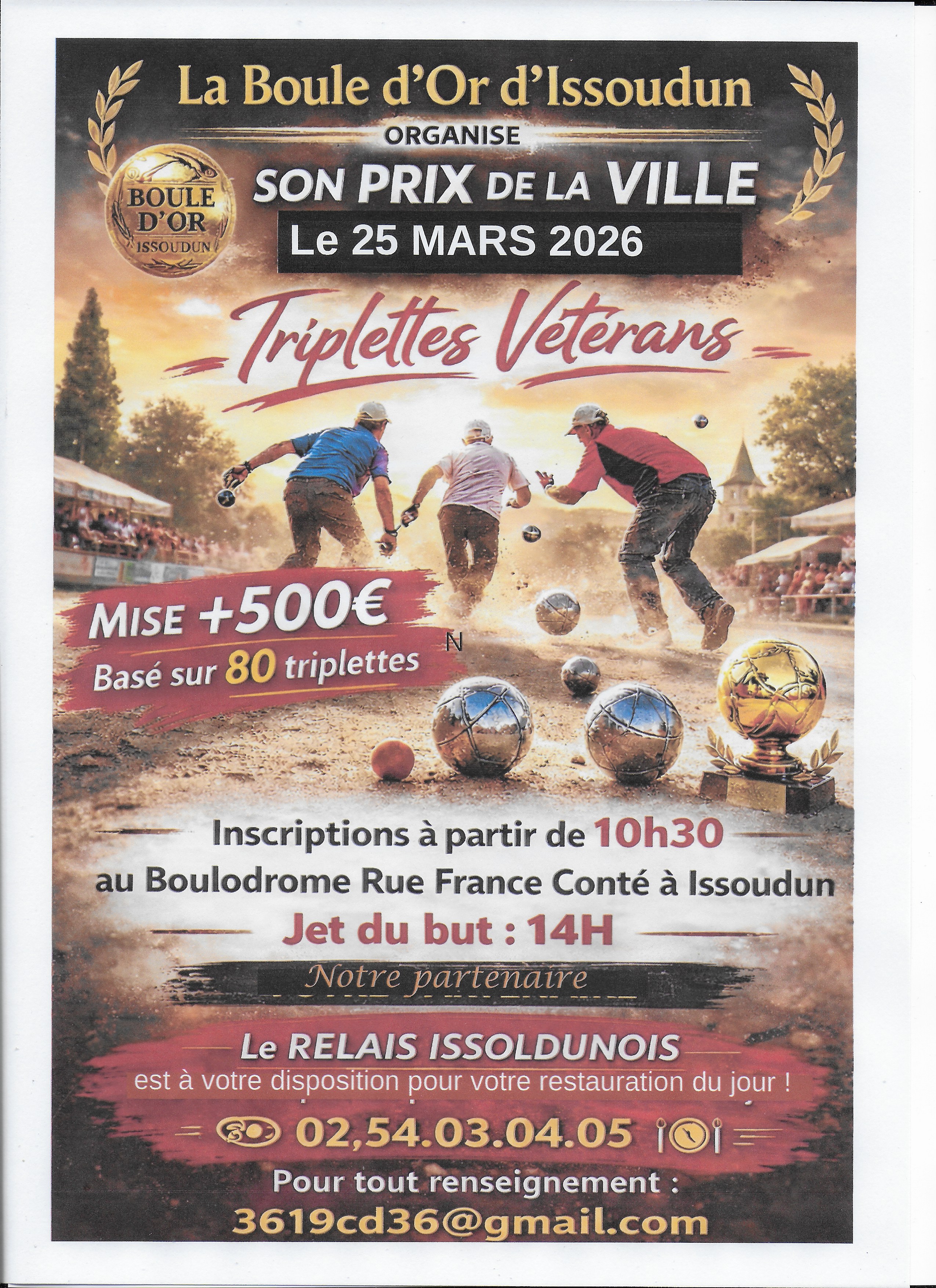 …La Boule d’Or d’Issoudun organise son prix de la ville le mercredi 25 mars en triplettes « 60 ans+ ». Inscriptions sur place à partir de 10h30, jet du but 14h00. Mises + 500,00 €.