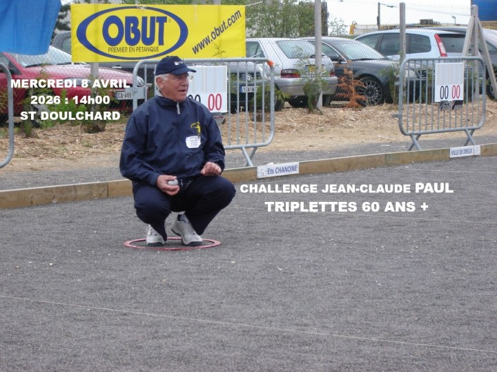 …Mercredi 8 avril 2026 se jouera au boulodrome de St Doulchard le challenge dédié à notre ancien Président Jean-Claude PAUL, décédé le 5 mars 2016. Concours en triplettes 60 ans + avec jet du but à 14h, cette compétition a été remportée en 2025 par une équipe de Pigny :Tonio FREIXNICHE-Djamel LITIM-Thierry ANGIBAUD.
