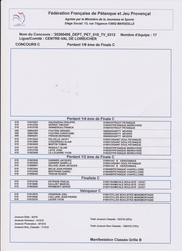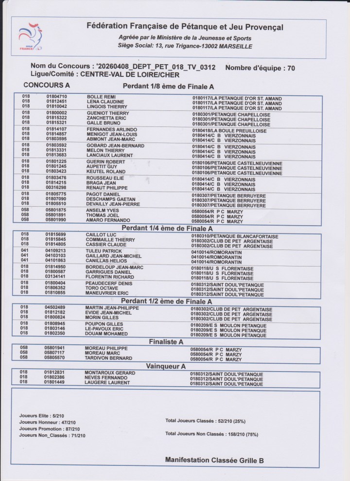 Dans le Complémentaire, défaite en 1/8ème pour Alain POLVEREL-« Ptitseb »-LAUVERGEAT (NH). En Consolante, défaite en 1/2 finale pour DELAGE-Isa et son père Jacky (NH), en 1/4 de finale pour Jacky PELOILLE-Alain COQUEREAU-Tomas MARTIN (SDP18), ainsi que pour JPS-SALEUR-CHARPY (NH). Défaite en cadrage pour Pierrot-Jo-Jean-Marie (à confirmer)