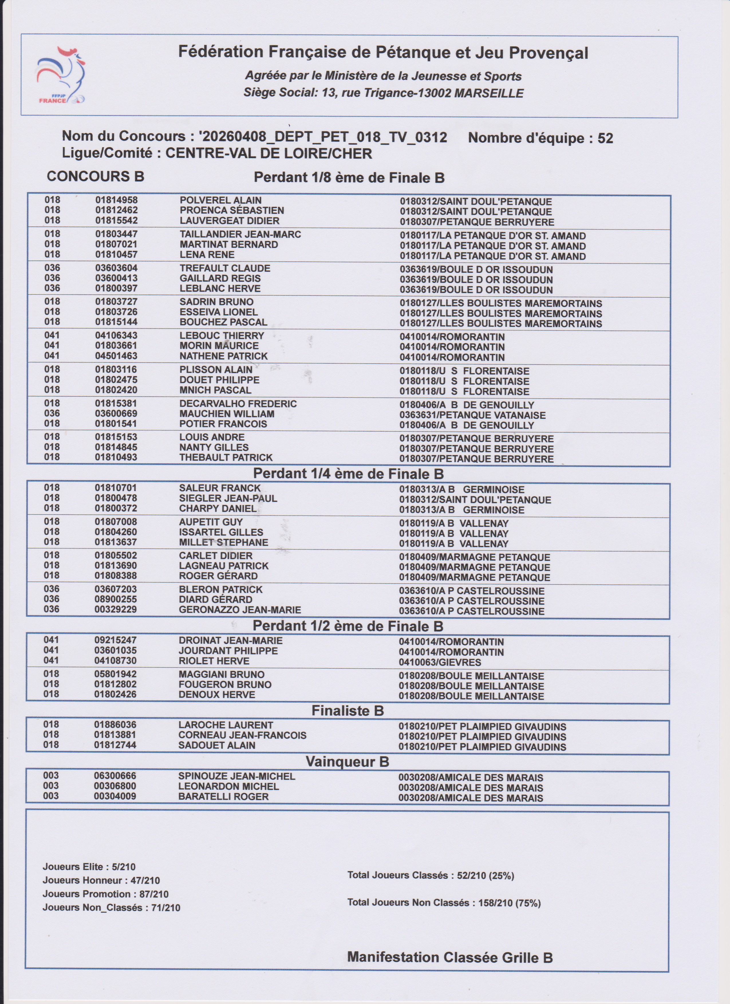 Dans le Complémentaire, défaite en 1/8ème pour Alain POLVEREL-« Ptitseb »-LAUVERGEAT (NH). En Consolante, défaite en 1/2 finale pour DELAGE-Isa et son père Jacky (NH), en 1/4 de finale pour Jacky PELOILLE-Alain COQUEREAU-Tomas MARTIN (SDP18), ainsi que pour JPS-SALEUR-CHARPY (NH). Défaite en cadrage pour Pierrot-Jo-Jean-Marie (à confirmer)
